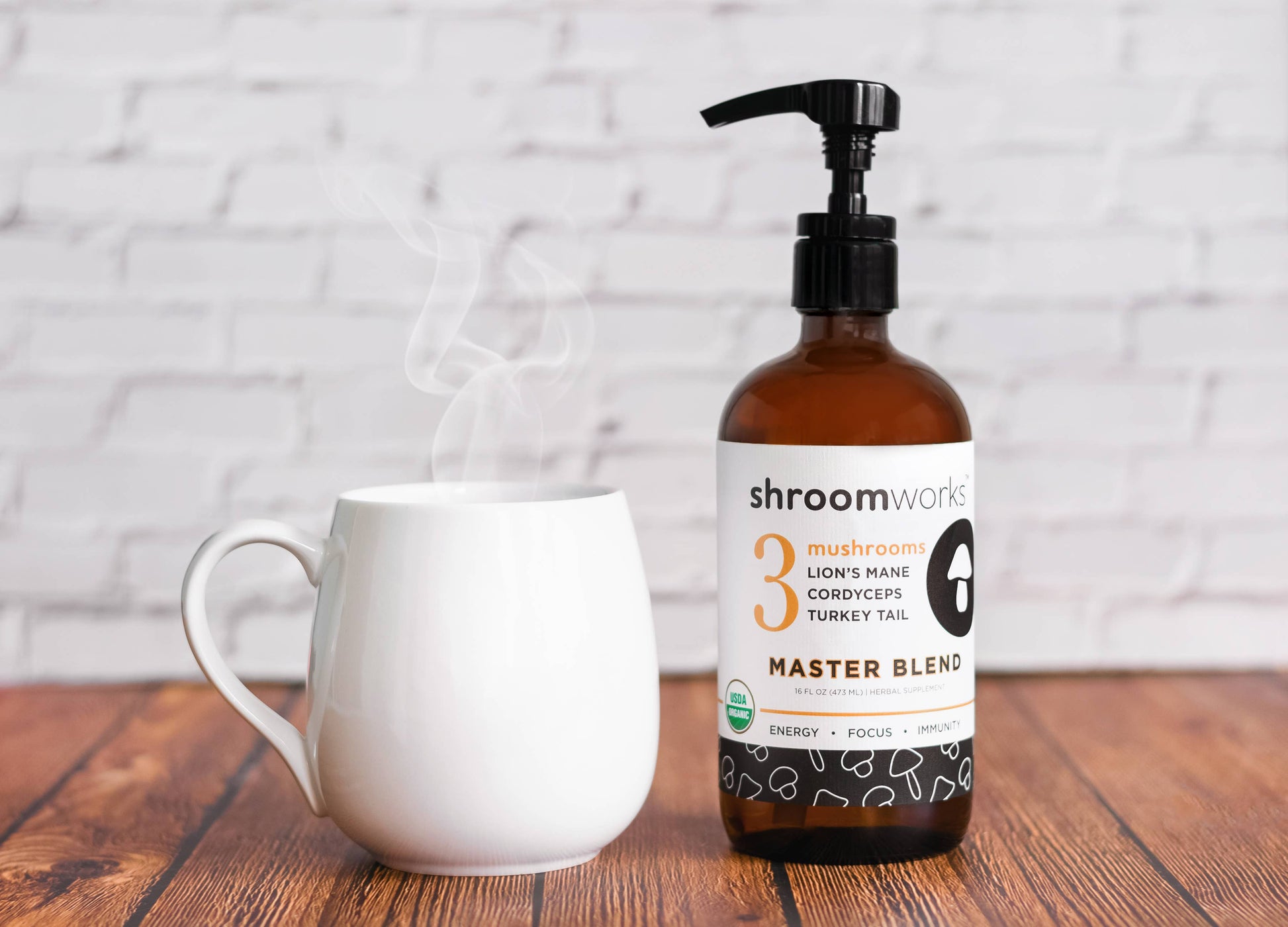 Shroomworks Mushroom Master Blend combines three powerful adaptogenic mushroom extracts—lion’s mane, cordyceps, and turkey tail—to naturally enhance focus, energy, and immunity. Packaged in a convenient barista-style pump bottle, it’s perfect for creating adaptogenic mushroom coffee or adding a functional boost to any beverage. With just one pump, you can effortlessly upgrade your drinks—no powders, no mixing, no mess! A perfect alternative to powders like Ryze mushroom coffee or Mud Water. Each bottle is 120 servings. Each serving contains 1000mg of mushroom extract. Bottled in a 16oz glass bottle, includes a pump. Shelf life 2 years at room temperature. How to use: Add 1 pump to any hot or cold beverage and enjoy (coffee, mocktails, etc). Ingredients: Organic Lion's Mane Mushroom, Organic Cordyceps Mushroom, Organic Turkey Tail Mushroom, Spring Water, Organic Cane Alcohol